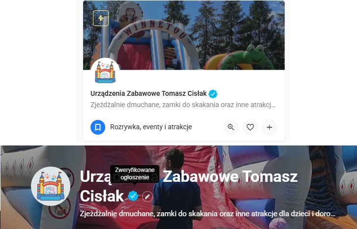 Status Firmy Zweryfikowanej jest dostępny po wykupieniu jednego z pakietów: „Wpis zaufany” lub „Wpis premium”. W obu przypadkach obok głównej nazwy ogłoszenia wyświetlana jest specjalna, niebieska ikonka. Po najechaniu na nią (w widoku głównym ogłoszenia) użytkownik zobaczy informację: „Zweryfikowane ogłoszenie”. (Przykład poniżej)
