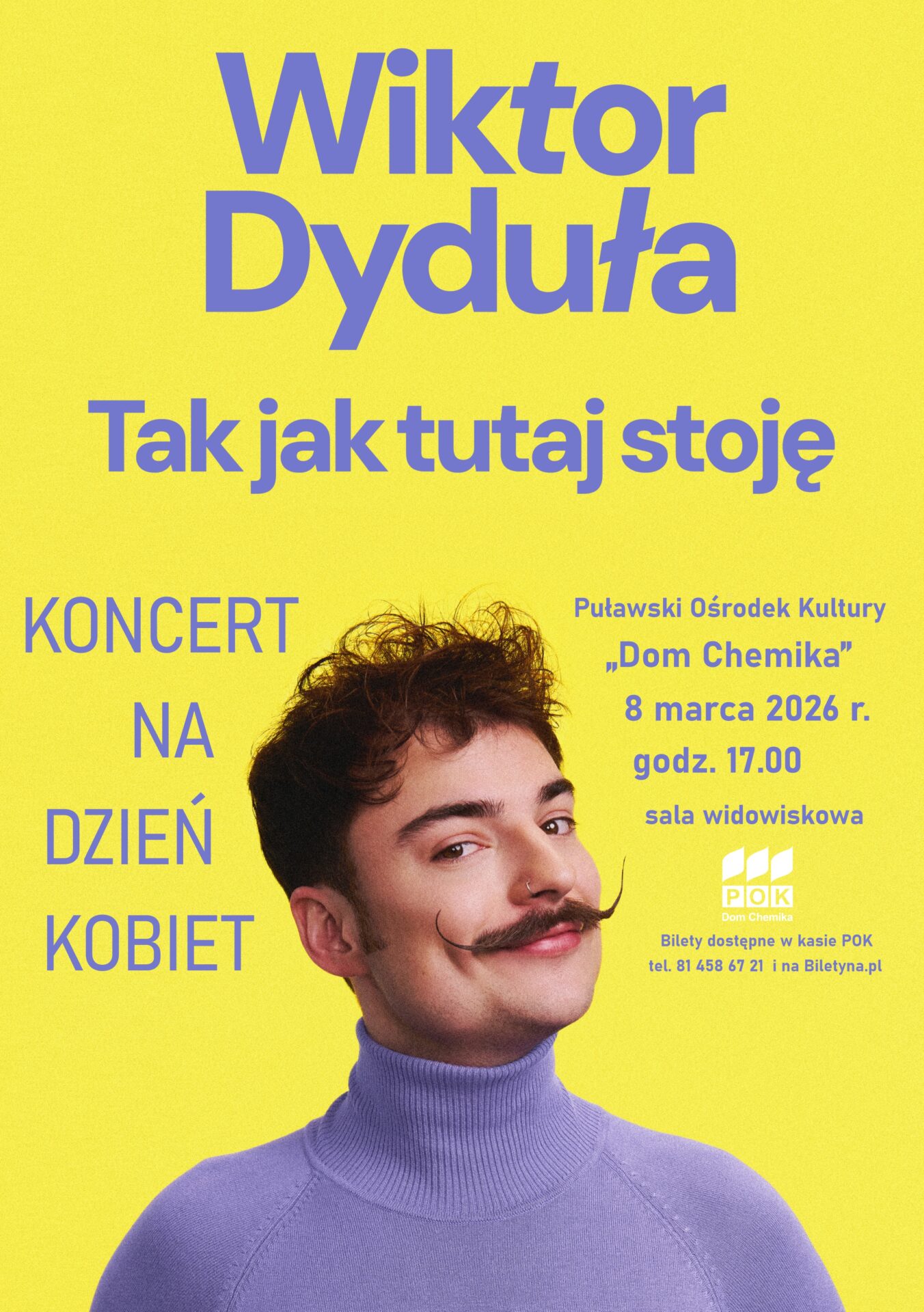 Na koncert Wiktora Dyduły w ramach trasy „Tak jak tutaj stoję” zapraszamy 8 marca 2026 r. o godz. 17.00 do sali widowiskowej POK „Dom Chemika”. Bilety dostępne w kasie POK tel. 81 458 67 21 i na Biletyna.pl.
