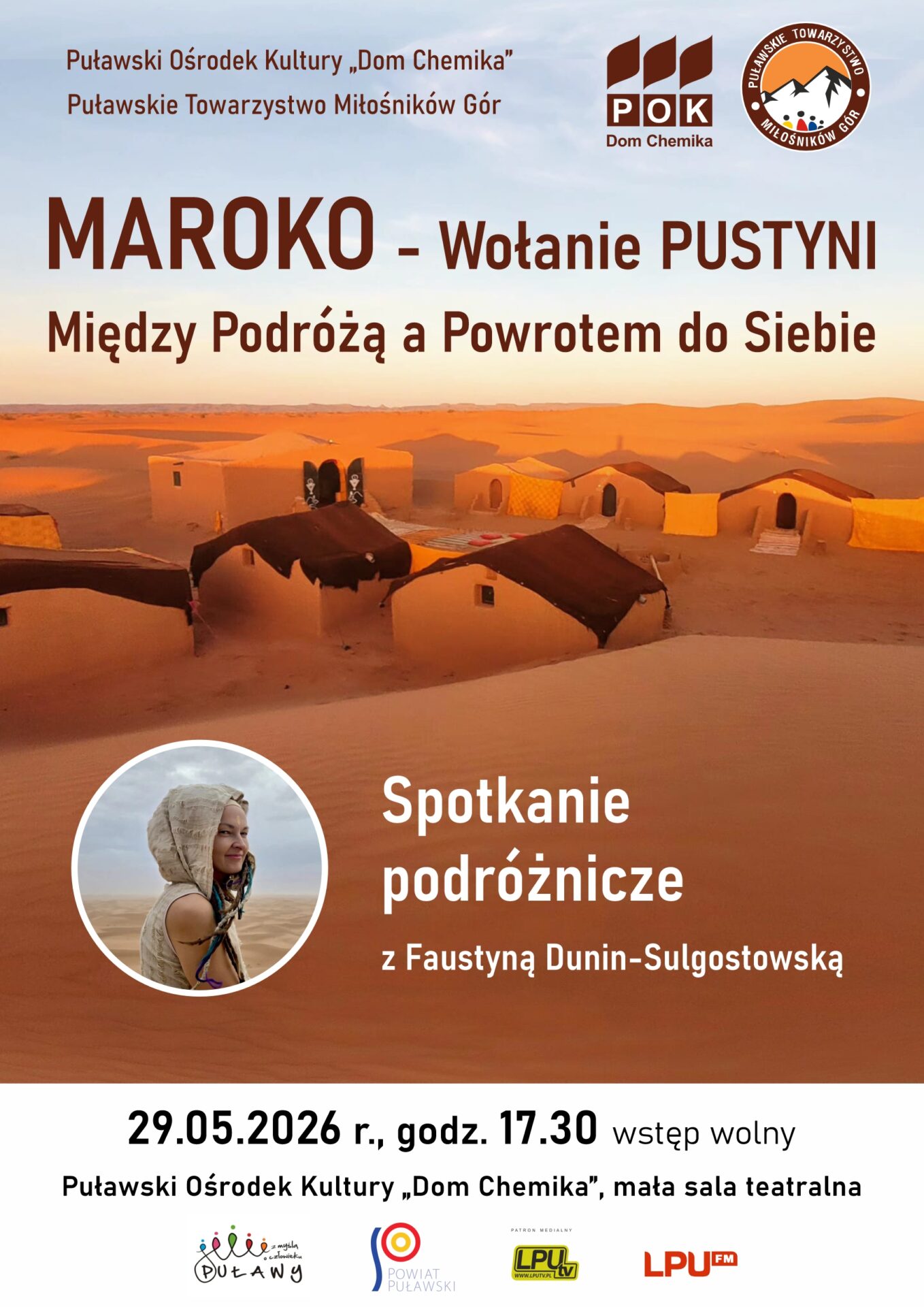 Puławskie Towarzystwo Miłośników Gór oraz Puławski Ośrodek Kultury „Dom Chemika” zapraszają na wyjątkowe spotkanie podróżnicze pt.: „Maroko – Wołanie pustyni. Między podróżą a powrotem do siebie”, które zabierze Państwa w niezwykłą podróż do serca Maroka – kraju pełnego kontrastów, barw i tajemnic.