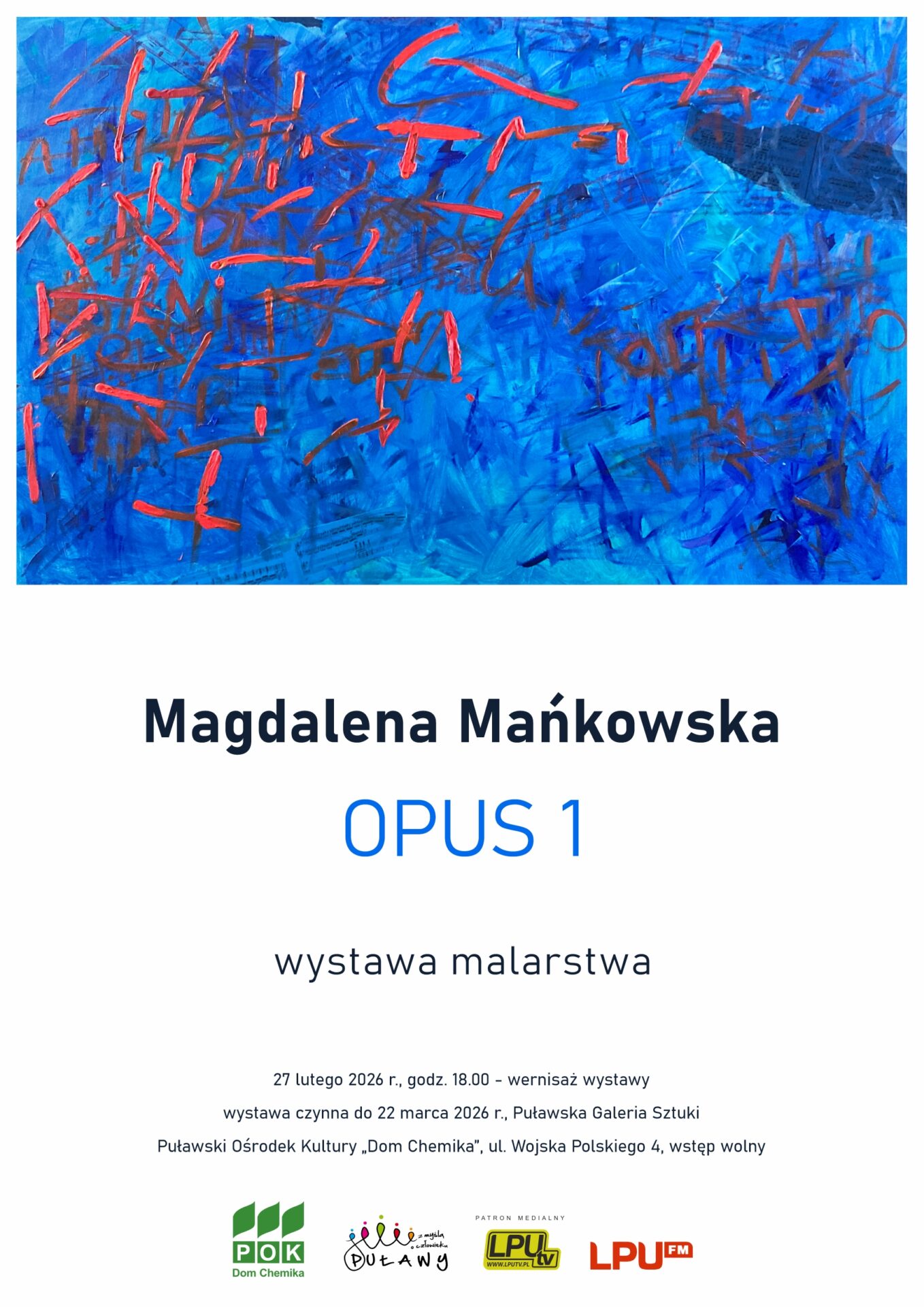 Serdecznie zapraszamy na wernisaż wystawy malarstwa „Opus 1” autorstwa Magdaleny Mańkowskiej, który odbędzie się w piątek 27 lutego 2026 roku o godz. 18.00 w Puławskiej Galerii Sztuki. Ekspozycja będzie dostępna dla zwiedzających do 22 marca 2026 roku.